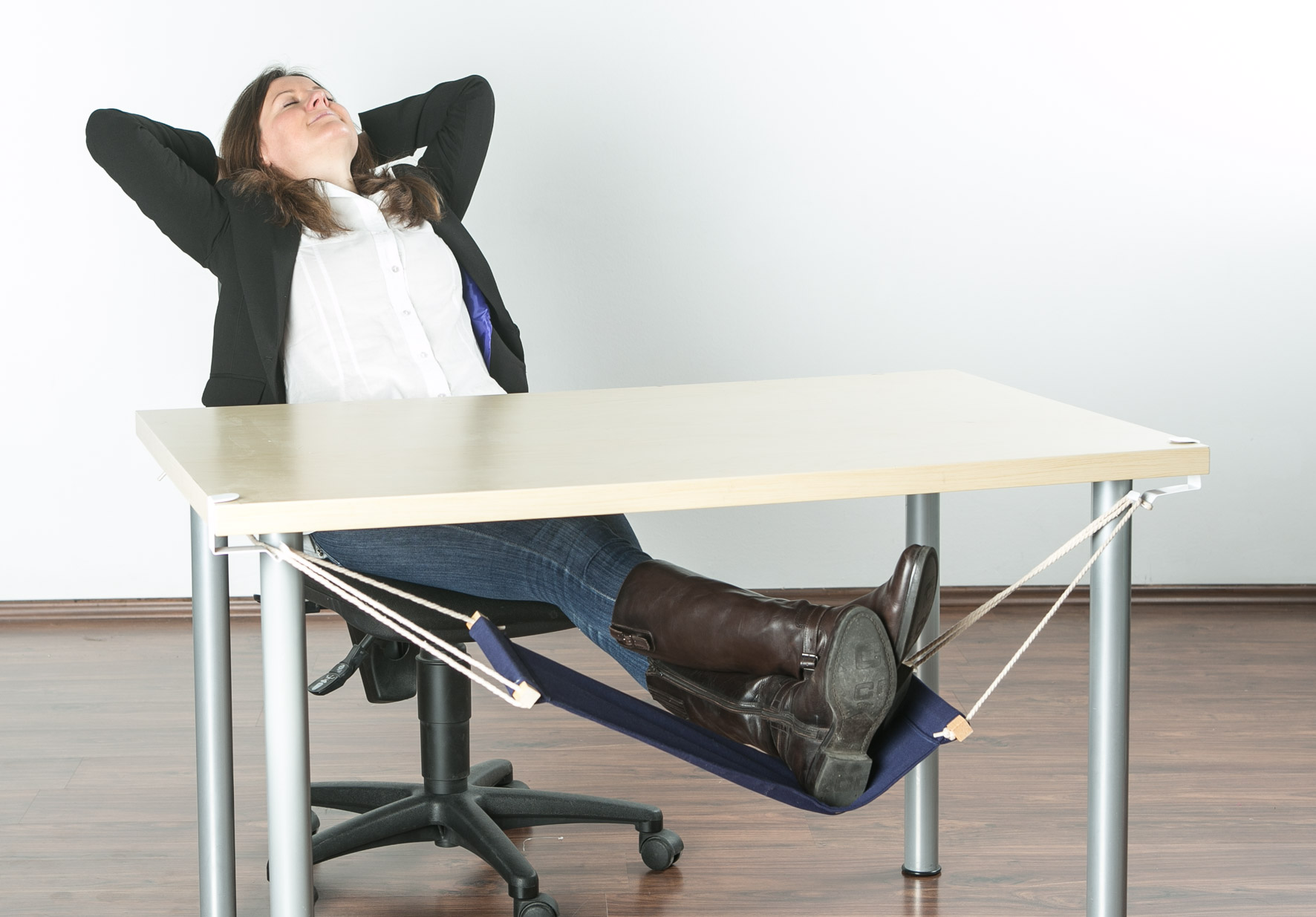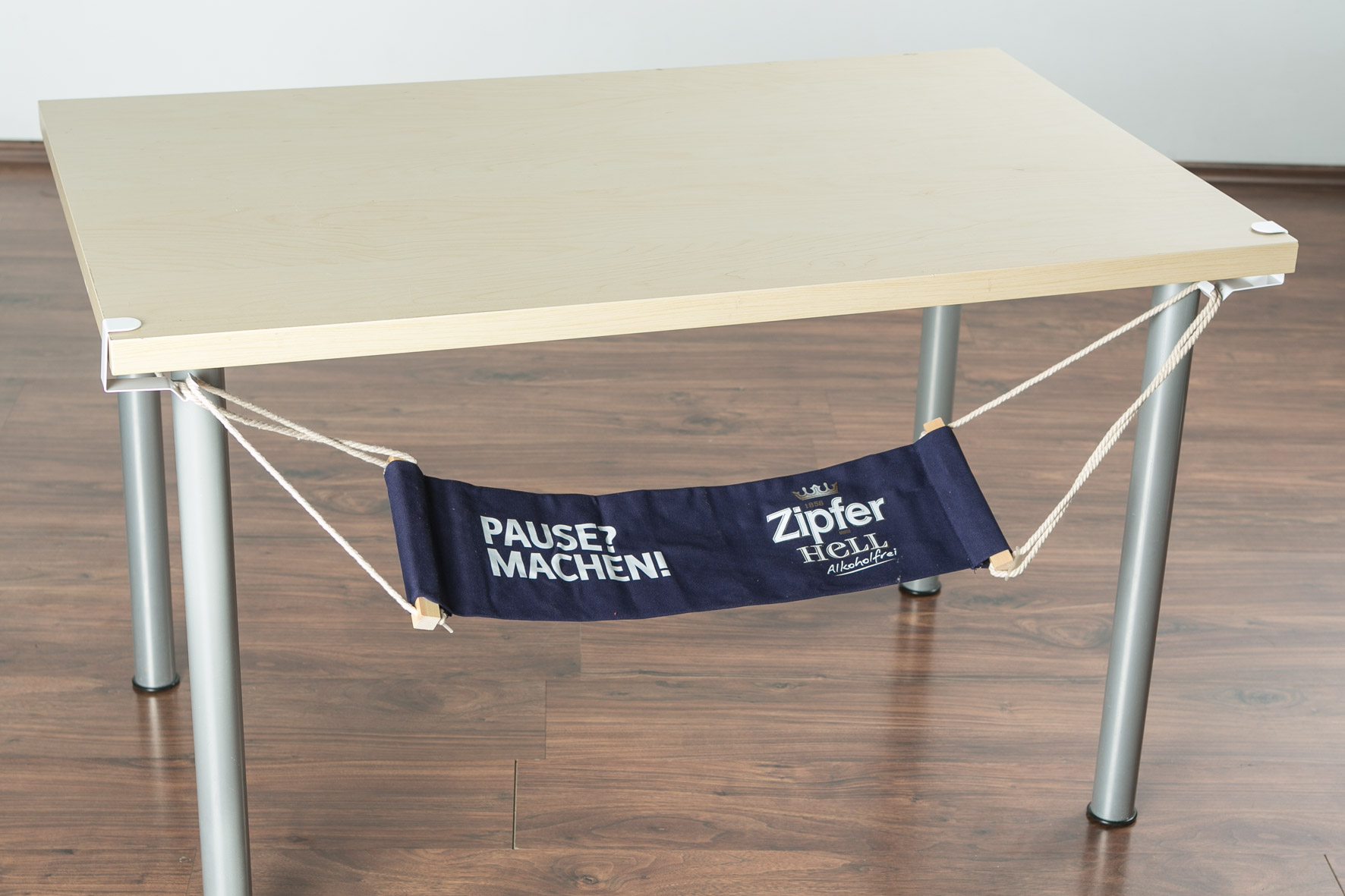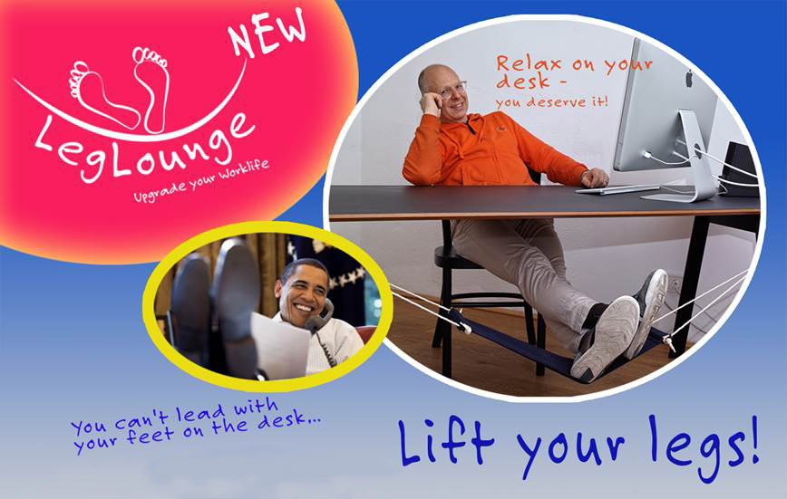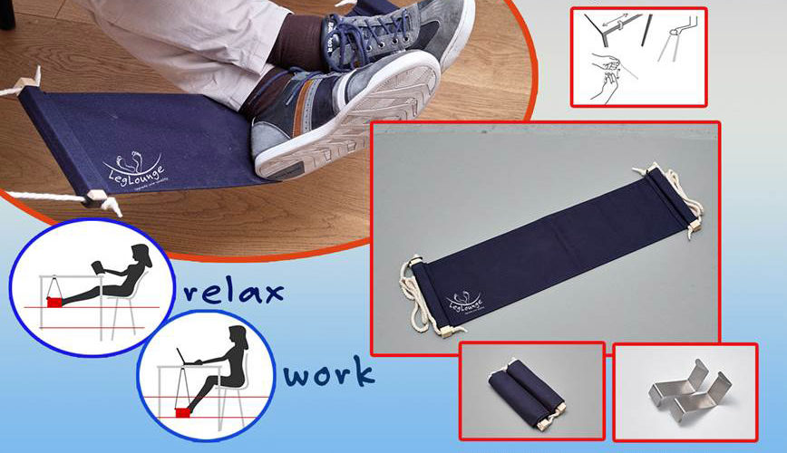 Leglounge ist ein völlig neue „Indoor-Hängematte“, die „müde Füße“ unter dem Schreibtisch entlastet. Leglounge sieht aus wie eine klassische Hängematte. Nur eben kleiner gemacht, passend für die Füsse. Mit 2 Haltehaken kann LegLounge einfach direkt unter dem Schreibtisch aufgespannt werden. Zwei praktische Stopper sorgen zusätzlich dafür, dass sich die Länge der Seile zwischen 20 – 45 cm einstellen lässt und somit die Höhe der Fußablage frei justiert werden kann. Dadurch ist es zusätzlich möglich, die Hängematte genau auf den aktuellen Bedarf bzw. die derzeitige Sitzposition einzustellen.