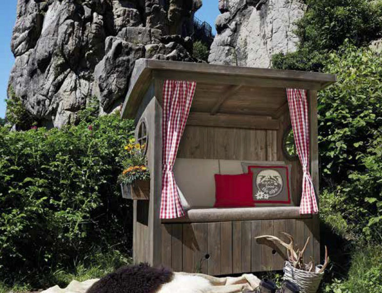 Ob fürs Sonnenbad oder fürs Picknick – die Outdoor-Lounge „Hüttenzauber“ aus wunderschönem, braunem Fichtenholz bringt märchenhafte Alpen-Idylle in Ihren Garten – oder Outdoor Aktivitäten. Diese neue Art der „Outdoor Lounge“ ist „die“ neue Wohlfühl-Oase. Der Strandkorb im Alpen-Look hebt Entspannung in eine neue Dimension. Das kleine Paradies mit verstellbarer Rückenlehne ist wie geschaffen für das behagliche und entspannte Sitzen in verschiedenen Positionen: Alleine, zu zweit, im privaten Reich oder im öffentlichen Raum – Legen Sie Ihre Füße ganz bequem auf die Fußstützen und versinken im bequemen Polster.