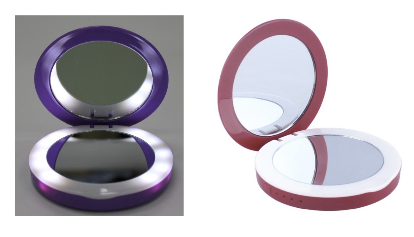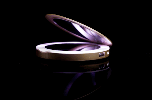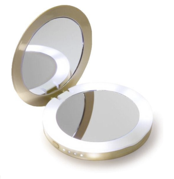 Beleuchteter Doppel-Kosmetikspiegel und Power Bank in einem. Ein eleganter Begleiter, der in keiner Handtasche fehlen darf!